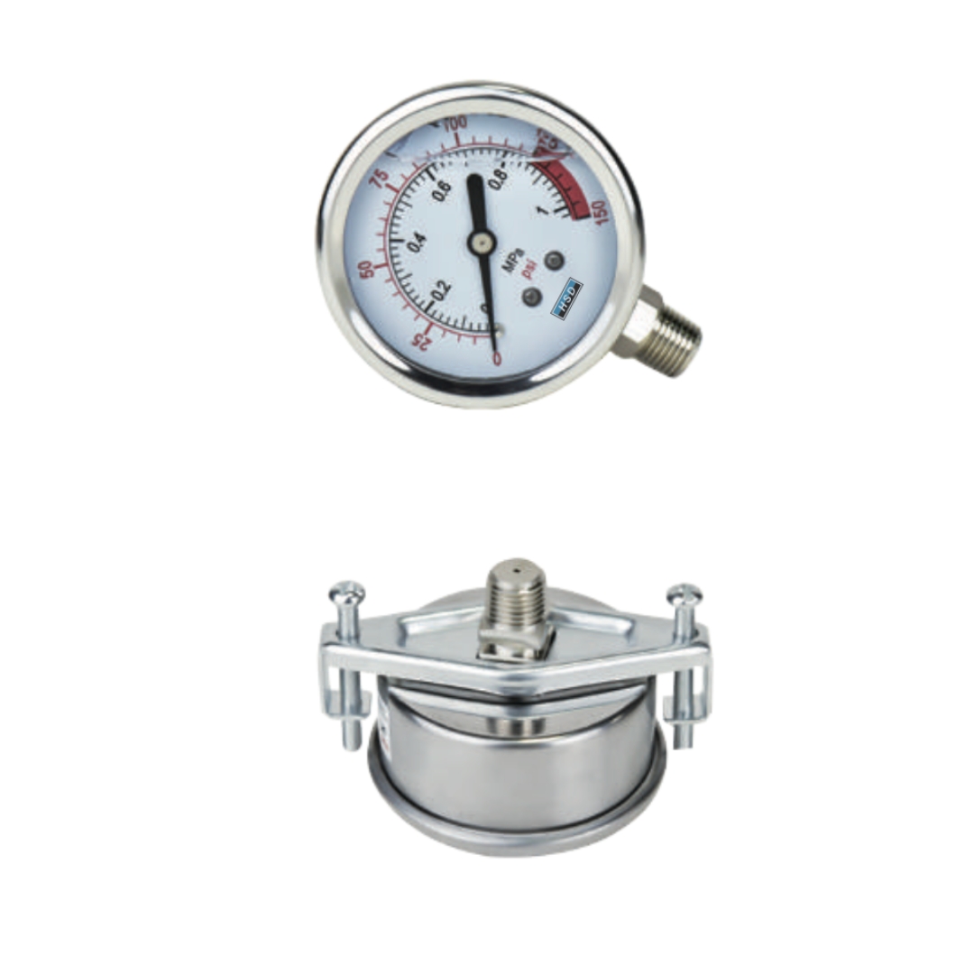 Thiết bị có cấu tạo bền chắc, thân bằng Inox hoặc hợp kim, mặt kính trong suốt, kim hiển thị nhạy và chính xác. Bên trong được bơm dầu glycerin giúp giảm rung, tăng độ bền và ổn định khi đo áp suất cao.